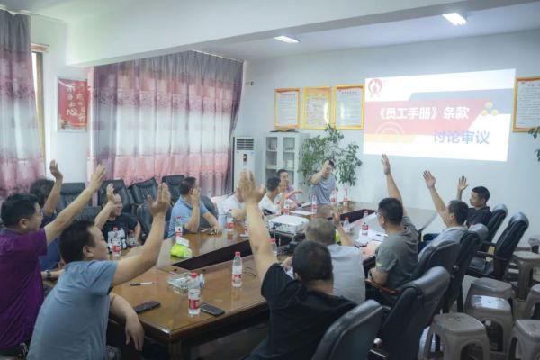 會(huì)議環(huán)節(jié),安環(huán)委主任通篇朗讀新版《員工手冊(cè)》安全管理?xiàng)l款,公司各部門中層及以上管理人員共同討論審議,舉手表決,全票通過(guò)。新版《員工手冊(cè)》將于2023年7月在朝陽(yáng)集團(tuán)正式啟用執(zhí)行。